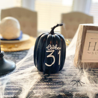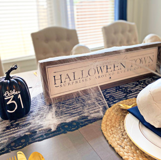 Until last year, I never really decorated the inside of my home but with Covid I wanted to bring a little extra joy in the house for the kids. I started to make affordable changes to transform the space. The only items I purchased for the dining room were the skulls, flameless candlesticks (which is totally unnecessary), the 31 pumpkin, the Halloween Town sign, and the bats. The candelabras and candle sticks were white, and silver and they were from our wedding. They had been sitting in our shed for 5 years, so I repurposed them and spray painted them black. You could easily go to Goodwill or any second hand store. Regarding the bats, last year my husband and I cut them out using a template and black construction paper. I saved them for this year but they were discolored. I simply did not have the time to cut out new ones this year so I bought them from Amazon. Everything else (cobweb, creepy fabric) were left over from other projects. Links to everything are below.